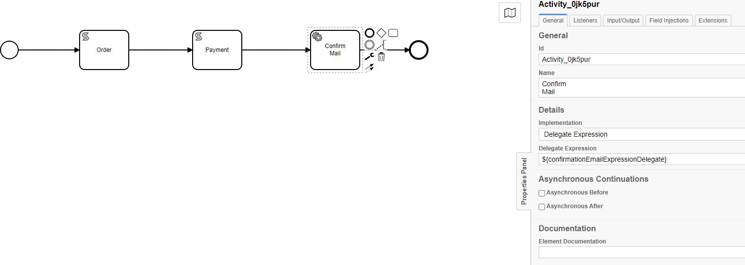 Now we will make use of expression. Now instead of using delegate expression for specifying the service task we will be making use of expression where we specify the bean name along with the method name. So select the implementation as a delegate expression. The expression will be of the format - ${beanName.methodName(execution)}. The execution variable is automatically available in the expression context in Camunda. In our case the bean name will be the java class name in camel case along with the method name which is ${confirmationEmail.sendMail(execution)}