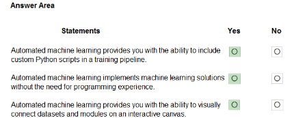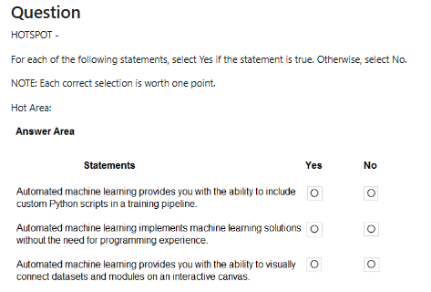 The correct answers are: Statement 1 - Yes, Statement 2 - Yes, Statement 3 - No. Statement 1 is True because Azure Machine Learning designer does provide a drag-and-drop visual interface that allows users to build, test, and deploy machine learning models without writing code by connecting pre-built modules on a visual canvas. Statement 2 is True because the designer enables you to save your machine learning workflows as pipeline drafts, allowing you to preserve your progress, make iterative improvements, and reuse components across different projects. Statement 3 is False because Azure Machine Learning designer does not support custom JavaScript functions - it primarily uses Python-based modules and pre-built components; while you can create custom modules, they would typically be written in Python rather than JavaScript, as the Azure ML platform is primarily Python-based for custom scripting and module development.