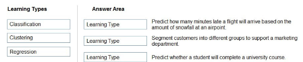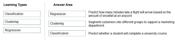 The correct matches are: 'Predict how many minutes late a flight will arrive based on the amount of snowfall at an airport' should be matched with Regression because it involves predicting a continuous numerical value (minutes of delay). 'Segment customers into different groups to support a marketing department' should be matched with Clustering because it involves grouping similar customers together without predefined categories, which is an unsupervised learning technique. 'Predict whether a student will complete a university course' should be matched with Classification because it involves predicting a categorical outcome (complete or not complete), which is a binary classification problem where the model assigns data points to predefined categories.