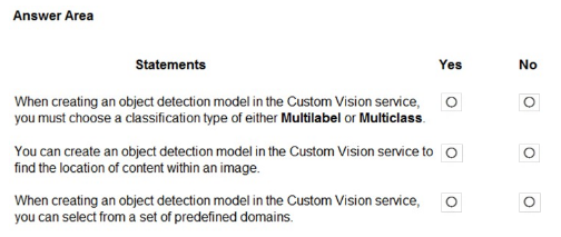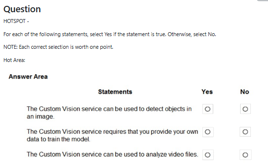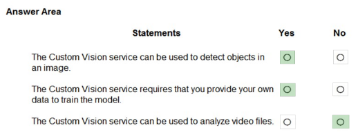 The correct answers are: Statement 1 - Yes, Statement 2 - Yes, Statement 3 - No. Statement 1 is True because the Custom Vision service is specifically designed for object detection and image classification tasks, allowing you to detect and identify objects within images by training custom models with your own labeled data. Statement 2 is True because Custom Vision requires you to provide your own training data - you must upload and label images that represent the objects or categories you want the model to recognize, as it doesn't come with pre-trained models for specific custom use cases. Statement 3 is False because Custom Vision is designed for analyzing static images, not video files; while you could extract individual frames from videos to analyze as separate images, the service itself does not directly process or analyze video files as a continuous stream.