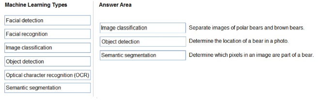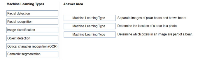The correct answers are: 'Image classification' for separating images of polar bears and brown bears, 'Object detection' for determining the location of a bear in a photo, and 'Semantic segmentation' for determining which pixels in an image are part of a bear. 'Image classification' is used to categorize entire images into predefined classes based on the overall content, which makes it suitable for distinguishing between types of bears. 'Object detection' identifies and locates objects within an image by placing bounding boxes around them, making it ideal for spotting the location of a bear. 'Semantic segmentation' provides pixel-level classification, assigning a label to each pixel in the image, which is necessary for tasks where the exact shape and area of an object like a bear must be delineated.