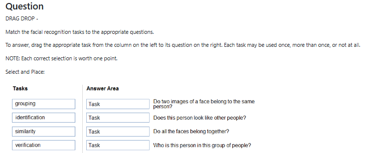 The correct answers are: 'Verification' for 'Do two images of a face belong to the same person?', 'Similarity' for 'Does this person look like other people?', 'Grouping' for 'Do all the faces belong together?', and 'Identification' for 'Who is this person in this group of people?'. 'Verification' is used to compare two face images and determine if they belong to the same individual. 'Similarity' involves finding faces that resemble a given face, often used in search or matching scenarios. 'Grouping' clusters similar faces together without prior labeling, which helps determine if faces belong to the same group. 'Identification' attempts to determine the identity of a face by comparing it to a known set of faces, answering the question of 'who' the person is within a group.