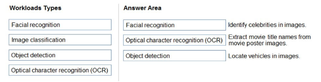 The correct answers are: 'Facial recognition' for identifying celebrities in images, 'Optical character recognition (OCR)' for extracting movie title names from poster images, and 'Object detection' for locating vehicles in images. 'Facial recognition' is a computer vision task that matches detected faces to known identities, making it suitable for identifying celebrities. 'OCR' is used to detect and extract text from images, such as movie titles on posters. 'Object detection' identifies and localizes objects, such as vehicles, within an image using bounding boxes. Each workload type is matched with its specific function in the scenario.