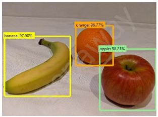 The correct answer is A (object detection). The annotated image clearly shows the characteristics of object detection: multiple objects (banana, orange, apple) are identified with bounding boxes drawn around each object, along with class labels and confidence scores (97.56%, 95.77%, 98.21%). Object detection not only classifies what objects are present but also localizes where they are in the image using rectangular bounding boxes. Semantic segmentation (B) would show pixel-level masks rather than bounding boxes. OCR (C) is for reading text, not identifying fruits. Image classification (D) would only provide overall image labels without localization information.