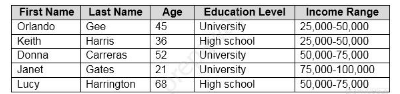 The correct answers are A (Education Level) and C (Age). In machine learning, features are the input variables used to predict the target variable. Since we want to predict Income Range, that field is the target/label, not a feature (eliminating option D). First Name and Last Name (options B and E) are typically not good predictive features for income as individual names don't generally correlate with income patterns. However, Age and Education Level are strong predictive features for income - age can indicate career experience and earning potential, while education level often correlates with income brackets. These two fields contain meaningful information that can help the model learn patterns to predict income ranges for new customers.