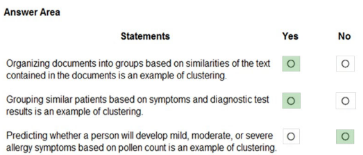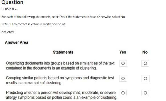 The correct answers are: Statement 1 - Yes, Statement 2 - Yes, Statement 3 - No. Statement 1 is True because organizing documents into groups based on text similarities is a classic example of clustering, an unsupervised learning technique that groups similar items together without predefined categories. Statement 2 is True because grouping patients based on symptoms and diagnostic test results is also clustering, where the algorithm identifies patterns and similarities to group patients with similar medical profiles together. Statement 3 is False because predicting whether a person will develop mild, moderate, or severe allergy symptoms based on pollen count is an example of classification (specifically multi-class classification), not clustering. This involves predicting specific predefined categories (mild/moderate/severe) based on input features (pollen count), which is supervised learning, whereas clustering is unsupervised and discovers hidden groupings without predefined target categories.