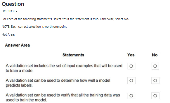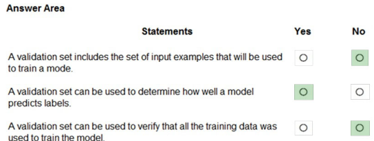 The correct answers are: Statement 1 - No, Statement 2 - Yes, Statement 3 - No. Statement 1 is False because a validation set does not include the input examples used to train the model - it is a separate dataset held back from training and used to evaluate model performance during development and hyperparameter tuning. Statement 2 is True because a validation set is indeed used to determine how well a model predicts labels by providing an unbiased evaluation of the model's performance on unseen data, helping to assess generalization ability and guide model selection. Statement 3 is False because a validation set cannot be used to verify that all training data was used to train the model - the validation set is specifically kept separate from training data to provide an independent assessment; instead, training logs or data tracking mechanisms would be used to verify training data usage.