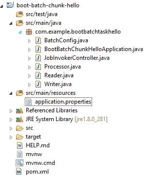 The spring boot project we will be implementing is as follows -Spring Batch chunk processing provides three key interfaces to help perform bulk reading, processing and writing- ItemReader, ItemProcessor, and ItemWriter.